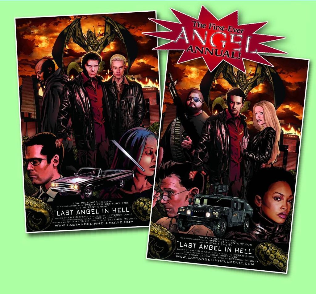 When L.A. went to Hell in After the Fall, so did thousands of screenwriters, one of whom wrote a movie based on Angel's experiences there. The first-ever Angel Annual presents an adaptation of Angel's travails, Hollywood-style, in Angel: Last Angel in Hell: The Official Movie Adaptation. By Brian Lynch and Stephen Mooney! Mooney presents two movie poster covers, one featuring the real Angel and company, the other with their Hollywood counterparts.