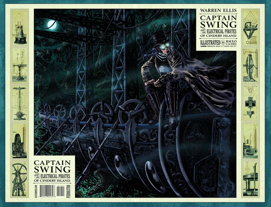 From the sparking-mad mind of Warren Ellis, comes an electrical romance of a pirate utopia thwarted: CAPTAIN SWING & THE ELECTRICAL PIRATES OF CINDERY ISLAND. London copper Charlie Gravel is on a boat ride to hell. He's about to discover what the people above his station really do to run the country, and to find out that, among the smugglers of the Blackwater and the dark creeks of Essex, there are such a thing as Electrical Pirates. This historical science-fiction piratical romance by Warren Ellis is illustrated in Raulo Caceres' stunning woodcut style, and presented in full color. It is the time of Captain Swing and his Electrical Pirates, and history will never be the same. CAPTAIN SWING #2 is available with a Regular or Wraparound cover by series artist Raulo Caceres, and a special retailer incentive Penny Dreadful cover designed to look like a classic novel of yore.