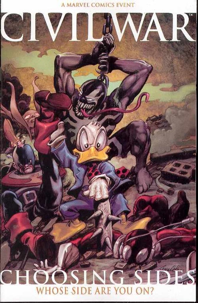 From Marvel Comics. A variant second printing of the exciting special.With Civil War encompassing the entire Marvel Universe, the effects of the war are being felt by every hero, villain, and civilian. Civil War: Choosing Sides One-Shot features five stories that shine a spotlight on the wildcards and impact players whose part in the Civil War has yet to be told, including Daredevil/Iron Fist, U.S. Agent, the Irredeemable Ant Man, Venom and even...Howard the Duck!?
