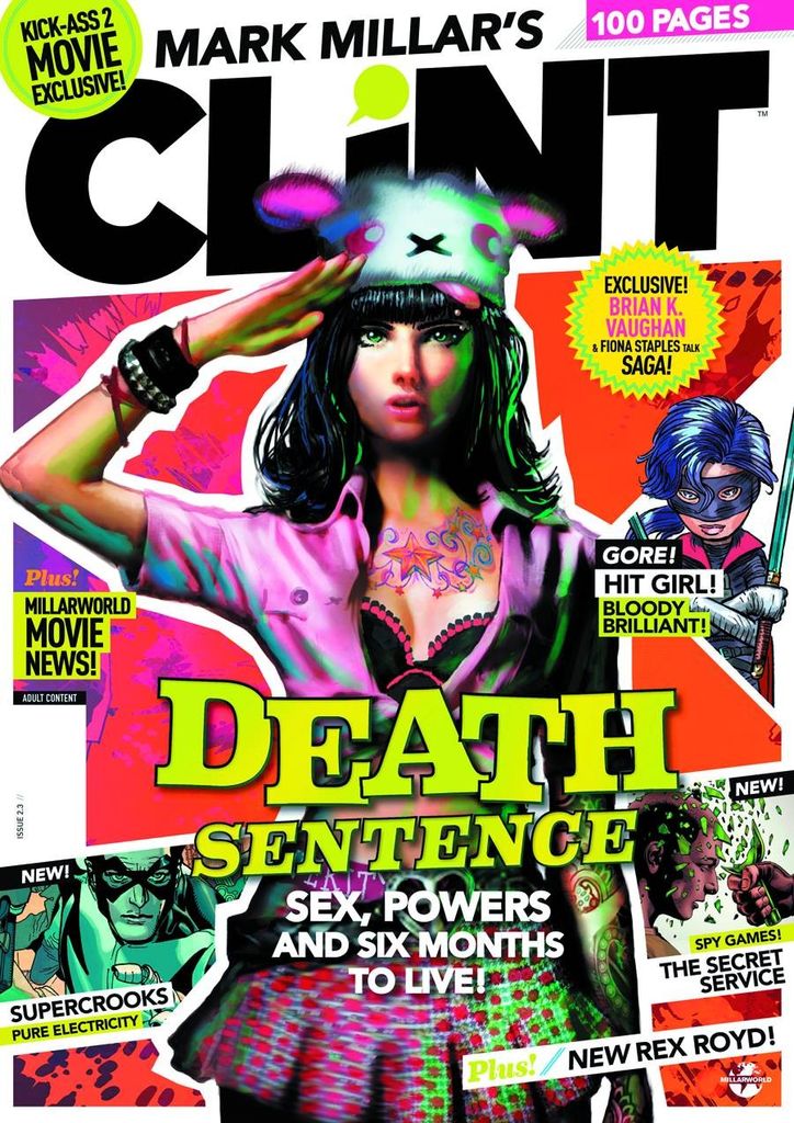 Bam! We're fully loaded with movie exclusives! Kick-Ass 2! Supercrooks! Matthew Vaughn and The Secret Service! American Jesus! More? How about an exclusive interview with Saga super-team Brian K. Vaughan (Y: The Last Man, Ex Machina) and Fiona Staples (Northlanders, DV8, North 40)? HUH?! Who - or what - is "Clint"? And don't forget about the incredible line-up of 6 comics! The heist takes flight in Supercrooks! Mindy's secret mission begins in Hit-Girl! Hard-corps training kicks off in The Secret Service! A government hit-squad guns for our "heroes" in the CLiNT-exclusive Death Sentence! And just when you thought you'd seen it all, here comes another brain-quaking episode of Rex Royd to prove you wrong! Plus: Graveyard of Empires!