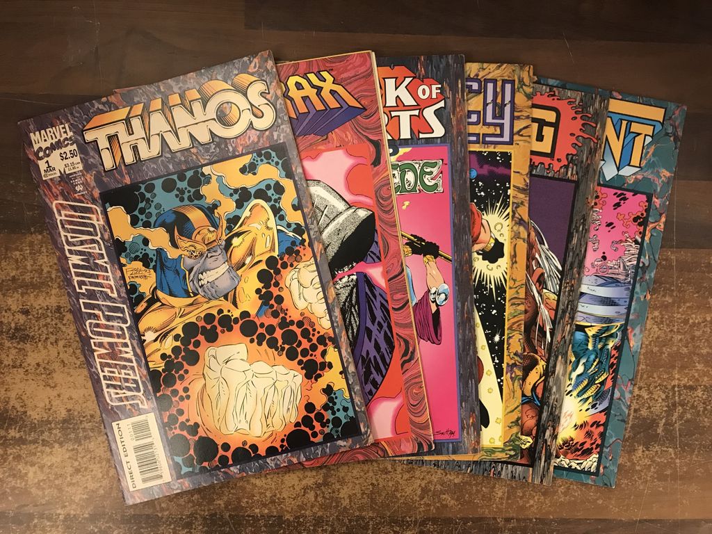 Knowledge Itself is Power, script by Ron Marz, pencils by Ron Lim, inks by Jimmy Palmiotti; Thanos plunges into combat with seemingly a whole world full of warrior mercenaries, destroying them all single handed with hardly even relying on his energy blast powers; Disappointed in the challenge he returns to his ship; Thanos breaks the mind of the Oracle of Ancient Knowledge, but finds his infinite well of knowledge a little lacking; He learns of Tyrant, a powerful opponent worthy of his efforts.