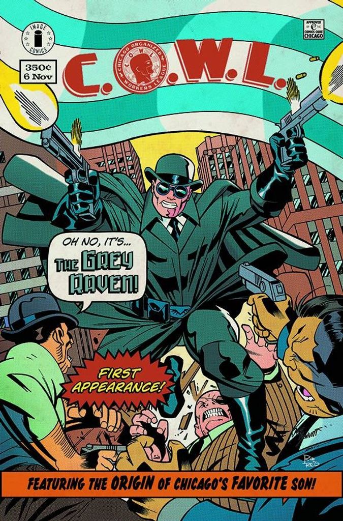 NEW STORY ARC! Before he started C.O.W.L., Geoffrey Warner fought for Chicago as the city's first hero, THE GREY RAVEN! But what started him down the path of crime fighting? Witness the origin of Chicago Superheroes, the War Years, and the formation of C.O.W.L. as told in the sellout issue written by C.O.W.L reporter and comic book writer Randall Winters.