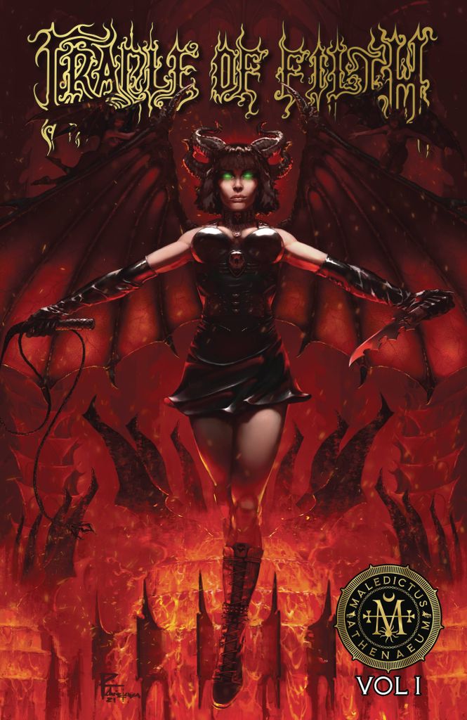 In the ruined halls of the Maledictus Athenaeum lie occult histories, sealed records, and cursed artifacts - this unholy archive explores the far corners of Cradle of Filth's musical legacy. Inspired by their albums and songs such as 'Bathory Aria,' 'Cruelty and the Beast,' 'King in the Woods,' and 'Darkly, Darkly, Venus Aversa,' this captivating journey delves into a vast universe of ageless vampires, mythical creatures, vengeful gods, and the enigmatic figure of Lilith. Within these hidden vaults, stories and poems come to life, penned by an all-star roster of comics talent and accompanied by lavish paintings. Step inside the walls of Cachtice Castle, where the Countess Elizabeth Bathory sheds virgin blood, and journey under the mesmerizing moon in the hymn to its beauty personified by the celestial huntress Diana. Amidst the echoes of anguish and ecstasy, discover tragic romances and delve deep into the darkly poetic and haunting world of Cradle of Filth's musical legacy.