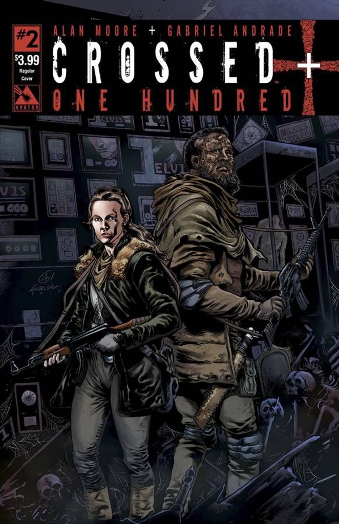 Alan Moore places his unique stamp upon the Crossed universe, as he and artist Gabriel Andrade paint a vivid picture of the future 100 years after the outbreak! Future Taylor leads a salvage team that is exploring the ruins of Tennessee. She tries to piece together the past, while they gather supplies for the future. Together with the settlement of Chooga, they take the tentative steps of a new generation as they attempt to understand the horror that nearly wiped out the human race. But disturbing threads emerge, some sightings of Crossed occur, and a century-old mystery begins to be revealed. This multi-layered story delivers a new brand of horror to Crossed fans at the hands of the scribe that redefined the comics medium. Enter Alan Moore's world of grueling survival with Crossed +100. This masterwork is a self-contained whole new world, no prior knowledge of the Crossed series is needed. All the covers for the series have been planned out by Alan Moore, with the images enriching and expanding on the series. Clues and glimpses of what came before, and what might be, are found throughout the variant covers. American History X Wraparound - Each of these will depict a specific time in the past hundred years, showing how things have changed and offering a peek at some key events. Each cover will display the year in which it takes place to help build the full picture. Crossed Culture - These are all images of how the Crossed have changed the way they live. With few humans left to hunt, and the animal kingdom thriving with predators, even the thrill-driven Crossed have had to make adjustments to their lifestyle. Future Tense - Each cover is a homage to a famous work of science fiction, and each of those original works ties into themes of this series. New World Order Wraparound - These are not for the faint of heart or delicate of constitution. We can't even picture them in this catalog, they are visions of what an ideal all-Crossed world would be. If the madmen have their dreams come true, what would the everyday life look like? These covers are brutally intense images of true horror and may have scenes of torture, depravity, and nudity. These are clearly for adults only. Each copy of this edition will ship in a sealed polybag with a protective slip cover over the actual image to assure it can be racked in stores. The graphic pictured here is the slip cover only. Due to all these special protective measures this edition is strictly limited to initial orders. Also available with Retailer Incentive covers of Red Crossed and Design Sketch, showing the original works of series artist Gabriel Andrade. Don't miss out on the ultra-rare CGC Numbered Edition as well!
