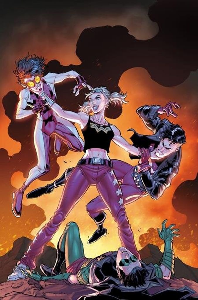 TALE OF TWO WONDER GIRLS! Impulse, Superboy, and Tim Drake were just saved by Cassie Sandsmark, Wonder Girl in the strange fantasy word they’re trapped in. And she’s here to help them navigate their retro surroundings. But…Cassie Sandsmark is back on our Earth searching for her friends alongside Red Tornado and the superhero formerly known as Arrowette. Which Cassie is lying and who’s about to get burned?!