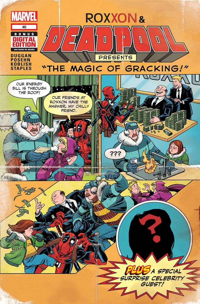 • The Roxxon Corporation brings us a special educational issue of Deadpool! • Learn about GRACKING-the energy source of the future! • Plus: a very special celebrity guest protest! Parental Advisory