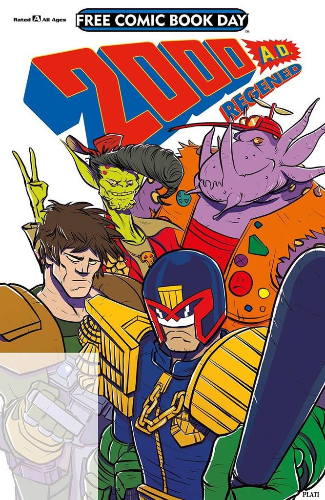 2000 AD Regened proudly presents a riotous all-ages comic featuring original, full-colour strips packed with thrill-power for Earthlets of all inception dates! Cadet Judge Dredd upholds the law in a blistering crime caper at an Aeroball game by Matt Smith and Neil Googe! Mutant bounty hunter Johnny Alpha earns his Strontium Dog badge from Alec Worley and Ben Willsher! Tharg's Futureshocks present the wonderful world of HumanCraft by Ned Hartley and Tanya Roberts! Help Chet Jetstream escape Hell Island by Henry Flint! The teenage alien delinquents return with an eye on causing chaos in 'D.R. & Quinch Hijack Free Comic Book Day' from Owen Michael Johnson, Colin Bell and INDIO! All-Ages.