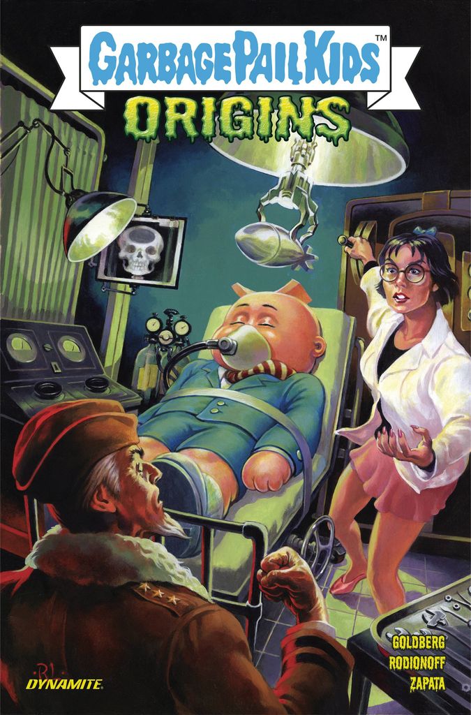 'The insane minds of Adam F. Goldberg, Hans Rodionoff and Jeff Zapata have joined forces to bring you the Garbage Pail Kids as you've never seen them before! Together with Dynamite Entertainment, they proudly present a tale more than 30 years in the making: Garbage Pail Kids: Origins! Reprinting issues #1-3 of the Earth-shattering original series, this all-new collection not only relates the epic saga of how our GPK heroes came to be, but also reveals how Adam Bomb and his gang of good guys were instrumental in the outcome of World War II and the fate of humanity! '