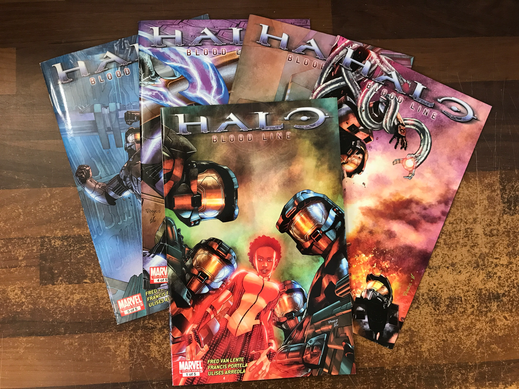 Written by FRED VAN LENTE. Art and Cover by FRANCIS PORTELA. Based on the Best-Selling X-Box Game! Blood Line is the top-secret unconventional warfare unit of the United Nations Space Command's Office of Naval Intelligence, engaging in sabotage and assassination missions deep inside Covenant space. But when this quartet of super soldiers is shot down over a desolate moon along with a Covenant cruiser, humans and aliens will have to forge an uneasy alliance against a common foe before an eons-old threat destroys them both!