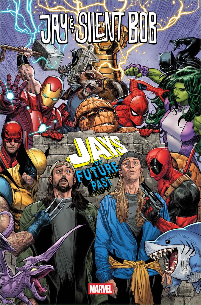 DOOM DECREES "THE DIM-WITTED DUO MUST DIE!" Capped, tan American Jay and friendly neighborhood wider-man Silent Bob make a quick stop in the Marvel Universe! But when Doctor Doom decrees these Jersey guys must die, the Fantastic Four, the Avengers, the X-Men and and a whole hoary host of heroes must team up on a joint mission to save the dim-witted duo from a lethal case of super-hero fatigue! "From the moment in Mallrats when they made the very first reference to Wolverine in cinema history, I've always wanted Jay and Silent Bob to meet their Marvel heroes in a comic book crossover - so much so that I pitched it to Stan the Man himself the day he shot his cameo in the movie way back in 1995. Thirty years later, Jays of Future Past represents both a love letter to the magic and mayhem of Marvel as well as giggle-inducing proof that our childhood dreams can still come true, even at age 55." - Kevin Smith