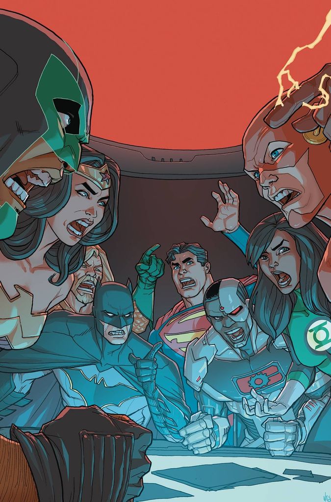 'JUSTICE LOST' part four! As public confidence in the League continues to fall, strained relationships within the team are set aside when Simon Baz is kidnapped by the mysterious figure known as the Fan: a zealous Justice League acolyte who was inspired by the team as a youth and who now deals death to the League's enemies. The Fan knows literally every detail about the League membership's powers and tactics, and easily turns their own systems and resources against them 'for their own good.' RATED T