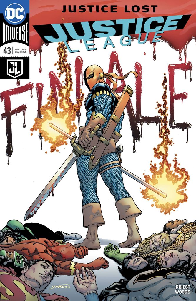 'JUSTICE LOST' finale! Struggling to save one of their own and extricate themselves from the grip of war, the Justice League's hand is forced by the mercenary Deathstroke! Decisions must be made about Red Lion's brutality, the insidious tactics of the Fan and the League's role as the World's Greatest Heroes. When the dust settles, will the old alliances still stand?