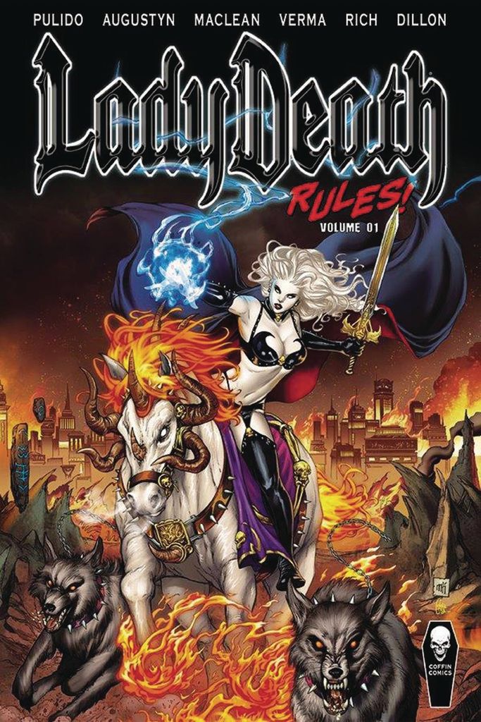 Lady Death awakes from a 20-year, spell-induced slumber and finds herself in the fiery pits of Hell. Who among her depraved enemies is responsible? Her epic, ultra-violent quest for answers brings her into conflict with Hell's rogues gallery: the nefarious Hellwitch, Atrocitas, an insane angel/demon hybrid assassin and Baphomet, a demonic religious zealot pledged to Satanus. Experience Lady Death fully realized! Chock full of sex, violence, and very, very bad behavior. If you want unapologetic, heavy metal inspired stories that kick your ass, Coffin Comics cordially invites all 'Fiends' new and old to get Lady Death Rules! Volume 1! Collects Lady Death: Chaos Rules #1, Lady Death: Damnation Game #1, and Lady Death: Extinction Express #1.