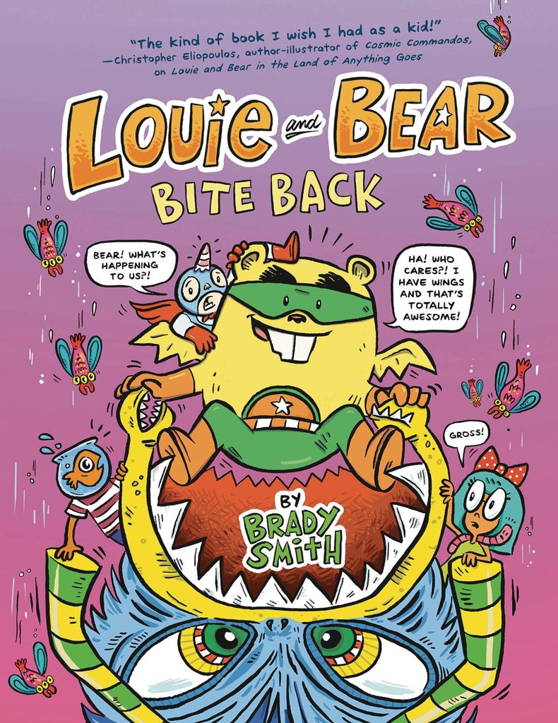 Return to the bizarre and exciting Land of Anything Goes! Louie, Bear, and the rest of their friends must escape back to earth when a new villain comes after them in this hilarious graphic novel sequel! Louie, Bear, and all their friends have settled into the good life in the Land of Anything Goes after their defeat of Hairy Larry. That is, until the villainous Panda Brain hits the scene and finds the Imaginator, a device that can create or transform anything the user imagines. Soon, wild things start happening: all the kids start going through odd changes, they keep getting attacked by a shape-shifting, lightning-generating monster, and the Land literally starts raining fish! Will the group be able to get home before the transformations are permanent, or will they be doomed to a new (and burrito-less) existence forever?