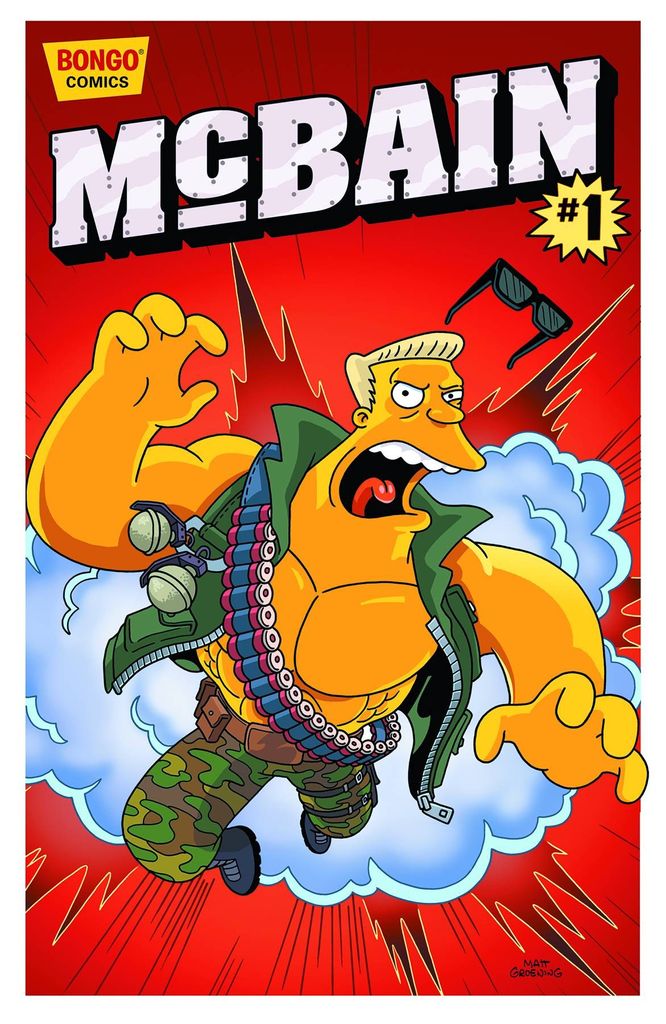 You Only Die Once! Springfield's #1 box office draw finally gets top billing on the Simpsons One-Shot Wonders marquee! Many of you may know him as the muscle-bound strongman turned action star Rainier Wolfcastle, but the world (as if that wasn't enough) knows him simply by one name - McBain! Never Say One-Shot Again!