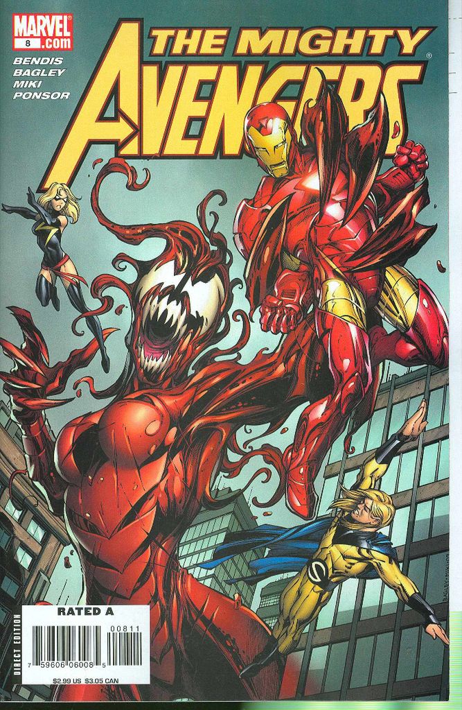 It's the Mighty Avengers versus the New Avengers who have been overtaken by a symbiote virus. So, yeah, it's Avengers versus Avengers symbiotes!! Janet gets new powers!! And the Mighty Avengers declare war on a foreign country!! All this and Mark Bagley too!!