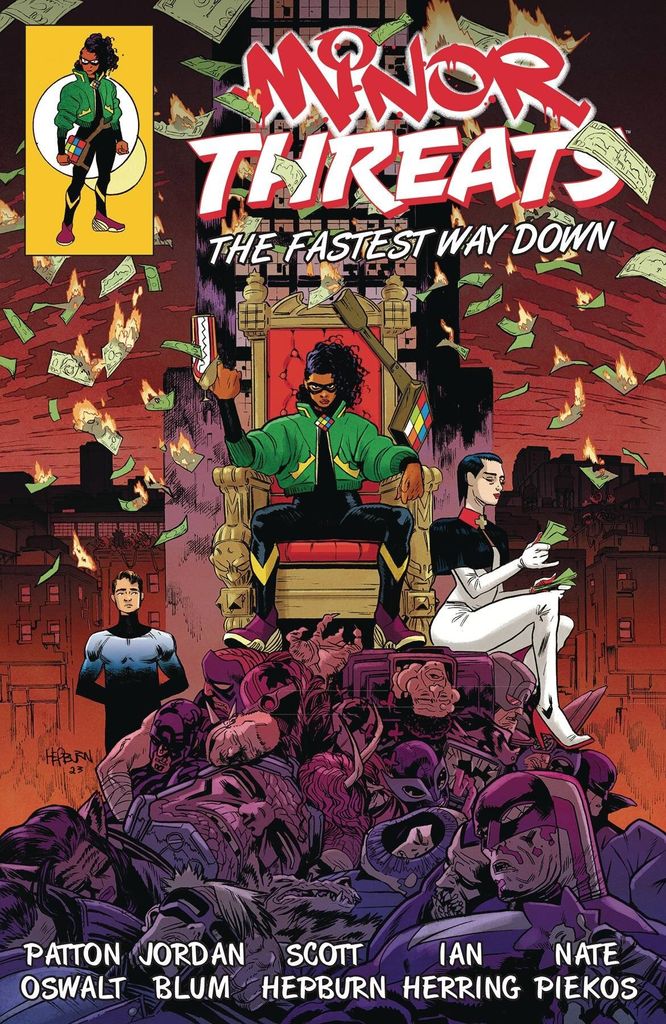 he hit superhero saga from Patton Oswalt and Jordan Blum, showrunners of Marvel's M.O.D.O.K on HULU, and superstar artist Scott Hepburn. Frankie Follis AKA the costumed criminal Playtime has won. Twilight City's greatest hero The Insomniac and its greatest villain The Stickman are dead, allowing Frankie to unify the super crook underworld and assert herself as the Queenpin of Redport. But Frankie is feeling the pressure from every side. Rival gangs are challenging her authority, Scalpel her consigliere is pushing her to legitimize her empire, and the act of murdering The Insomniac has broken something deep inside her. Frankie is about to learn the hard way... heavy is the head that wears the supervillain crown. Collects the comic book series Minor Threats: The Fastest Way Down #1-4.