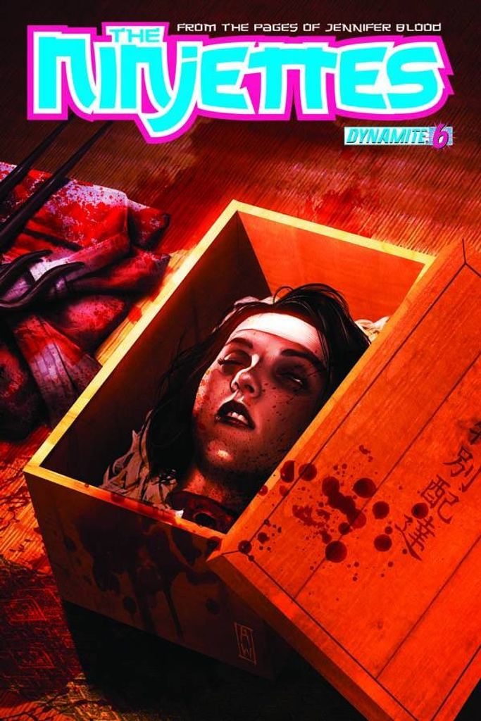 The Ninjettes are dead -- long live the Ninjettes! After the apocalyptic events of Jennifer Blood #4, Kelly Hara is a headless corpse in a wooden box! But for how long? One dead cast member will make a shocking return from the grave in this issue, and we might just be shameless enough to make it her!