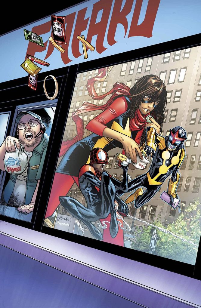 • NOVA IN NEW YORK! • Sam Alexander and the other ALL-NEW, ALL-DIFFERENT AVENGERS team up, and love might be in the air! • Featuring guest stars MILES MORALES and KAMALA KHAN! Rated T