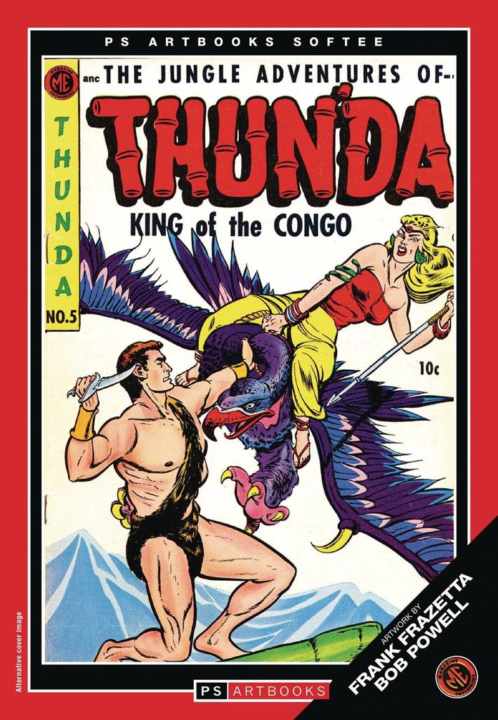 First appearing in comics in 1952 and on film in Columbia Pictures serial King of the Congo starring Buster Crabbe. Thun'da was a fictional 'Tarzanesque' character scripted by Gardner Fox and originally created by artist Frank Frazetta, with art from Bob Powell for issues #2 through #6. Thun'da was Roger Drum, a World War II United States Air Force officer who was shot down while flying over a valley deep in the heart of Africa. He was captured by hostile ape-men but managed to escape and wandered through the valley, pushing his exercise daily to become a paragon of physical perfection with the help of Pha, the queen of the valley people, who worshipped him after he killed 'the mother of all serpents' with his last three bullets. Collects Thun'da, King of the Congo #2-6 (1952-1953).