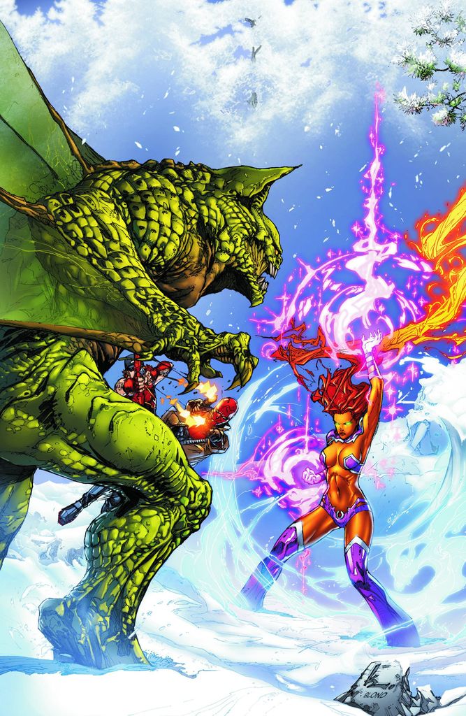 The man who has pursued Starfire all the way to the wilds of Colorado has only one thing on his mind: her slow and painful death. His name is Crux - and he's done some dark and dangerous work on his DNA to reach his goal of ridding the Earth of every alien on the planet! And Kori's about to learn that Red Hood and Roy Harper have their hands full with the ancient evil known as The Untitled!