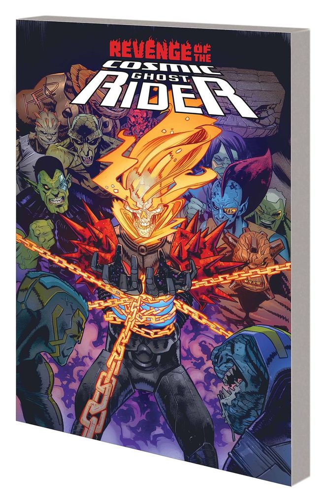 He's back, baby! With a reputation like Cosmic Ghost Rider's, it's only a matter of time before the law catches up to this flame-headed future version of Frank Castle and tries to put him in chains. Too bad for the cosmic cops that chains are Castle's new weapons of choice! On the run with a rogue hitchhiker in tow - the young Earth woman named Cammi - Frank must take on one of the biggest crime syndicates in the cosmos! But with his soul hanging in the balance, will he damn the whole galaxy to hell to get what he wants? Plus: A new short story from Donny Cates and Geoff Shaw, the crazed minds who kicked off the madness and introduced Cosmic Ghost Rider in the first place! Collecting REVENGE OF THE COSMIC GHOST RIDER #1-5. Parental Advisory