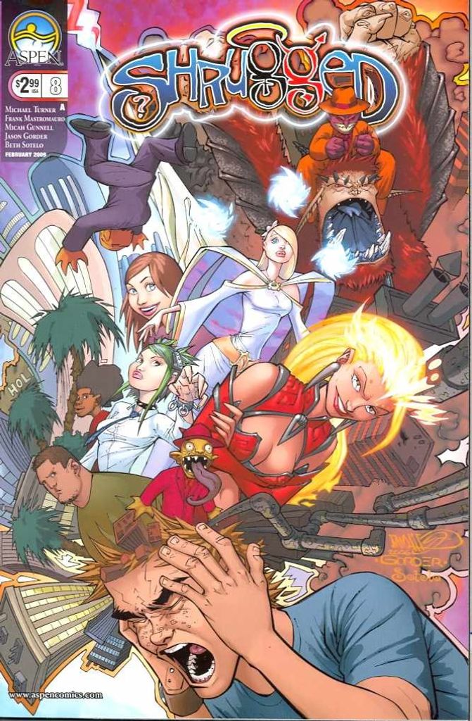 It's the finale issue of Shrugged! What more can we say except you really don't want to miss this issue! Brought to you one last time by the same great creative team of Michael Turner, Frank Mastromauro, Micah Gunnell, Jason Gorder, and Beth Sotelo. The final exciting installment of comic's newest hit franchise, Shrugged has arrived!