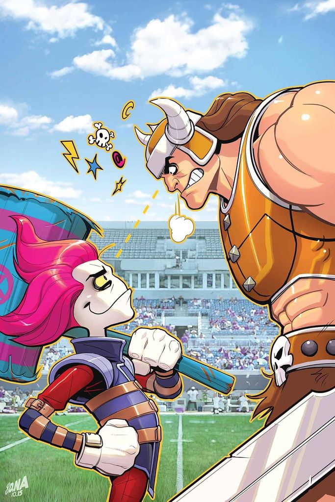 • Slapstick vs. Bro-Man! • Who or what is Bro-Man? Well, look at the cover! He's another cartoon-like character! • Also, is it weird that Slapstick is hiding a mad scientist in his parents' basement? Probably! Parental Advisory