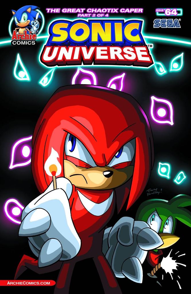 'The Great Chaos Caper,' Part Two. The chaos continues! It's hijinks and high explosives galore with Knuckles caught in the middle of all the action! The Chaotix and the Hooligans are falling over each other to get to a Chaos Emerald - the key to saving (or dooming) the world! It's up to Knuckles to power through the madness and complete his own mission, and in his travels, you'll never believe who he finds! Featuring new cover art from Tracy Yardley and a rad red SEGA Variant cover!