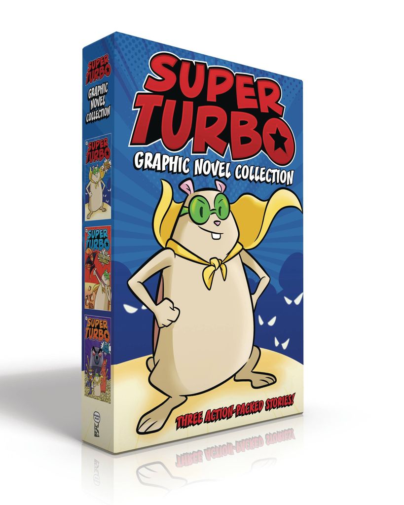 The classroom pets of Sunnyview Elementary band together to form a Superpet Superhero League to fight crime! Turbo the hamster is the official classroom pet of Classroom C at Sunnyview Elementary… and he has a top-secret identity as Super Turbo, crime-fighting superhero! He can't believe it when he finds out he's not the only superpet in town (or in school)! Blast off with their first three chapter book graphic novel adventures in this collectible paperback boxed set. Collects Super Turbo Saves the Day!, Super Turbo vs. the Flying Ninja Squirrels, and Super Turbo vs. The Pencil Pointer.