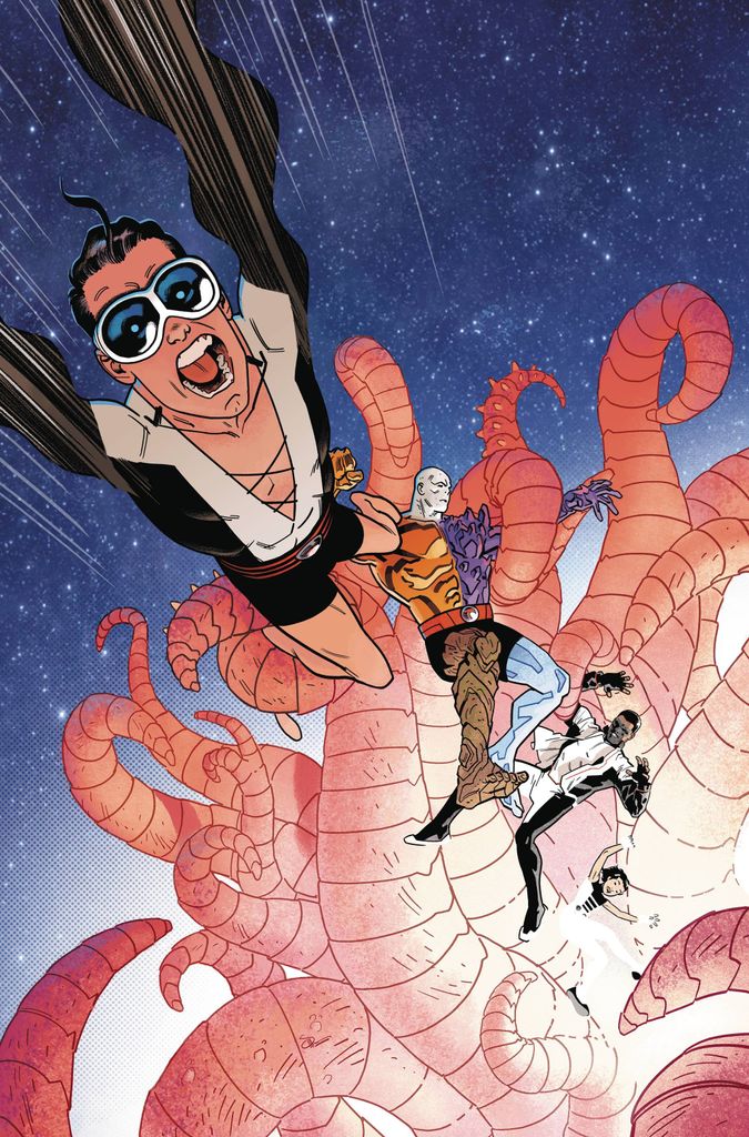 'THE GIRL FROM BGZTL'! Return with the Terrifics to the Phantom World! As our heroes continue their trek through the multiverse (dark or otherwise) to find a cure for the condition that binds them together, their journey brings them to the home planet of Phantom Girl. This is one tearful reunion you do not want to miss! Plus, a giant space squid attacks! That's right, a giant space squid!