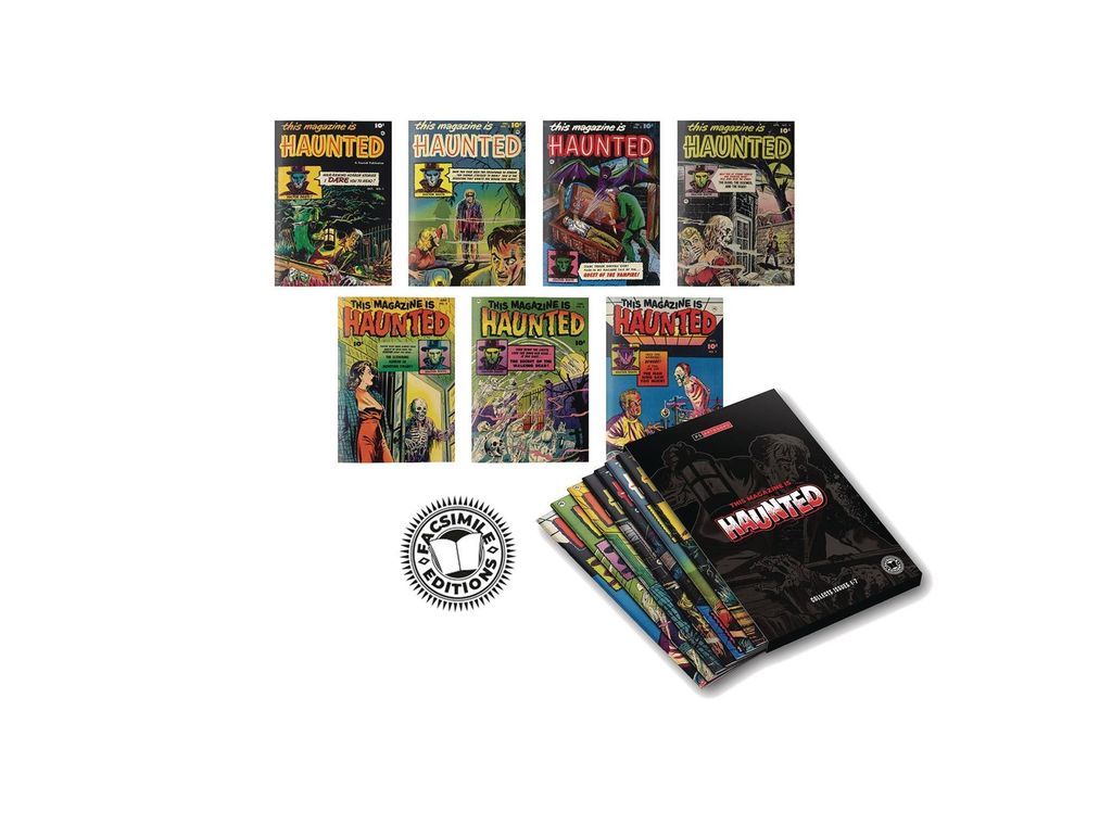 Collect the first 7 issues from the legendary series by Fawcett comics, This Magazine is Haunted! For the first time ever collect 7 Facsimile Editions in one premium Slipcase! Issues 1-7, first printed by Fawcett Comics in October 1951 is full of re-animated corpses and goosebump inducing stories that are guaranteed to make the hairs on your neck stand up! With artists such as Sheldon Moldoff, George Evans, Bernard Baily, Bob Powell and Leonard Frank we guarantee you will be left quaking in your boots! With over 200 pages of nightmare fuel you can't get much better bang for your buck!