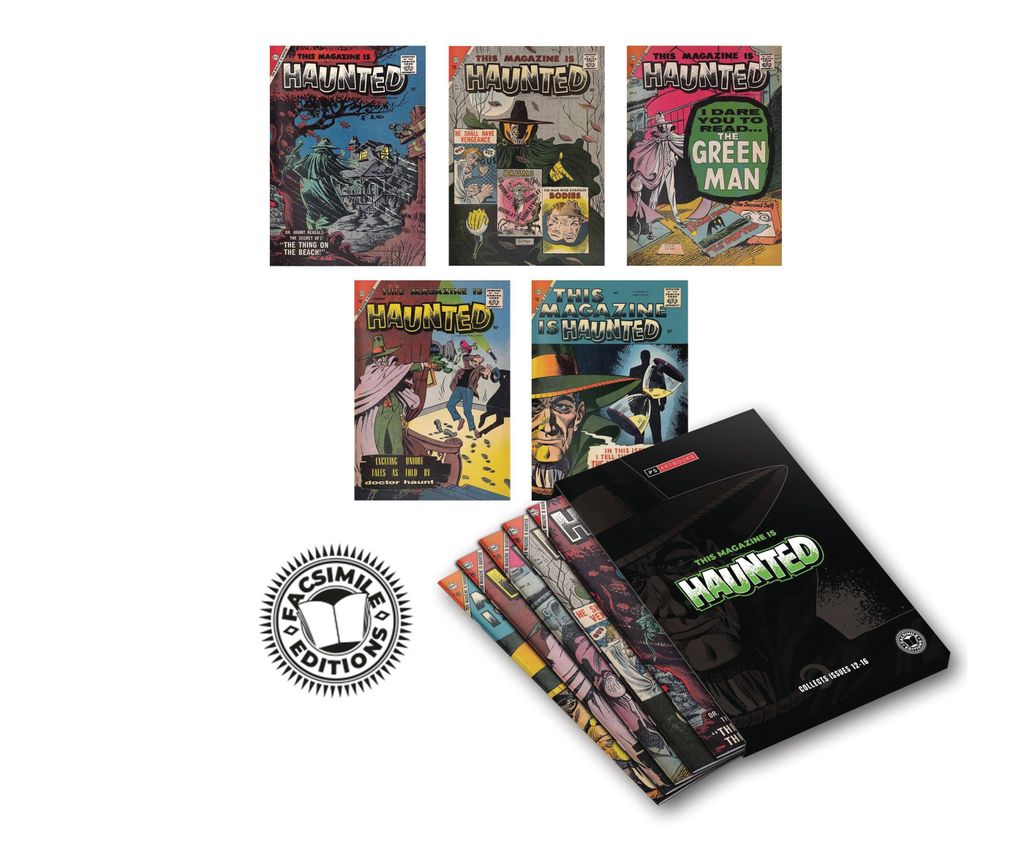 Collect the last wave of 5 issues from the legendary series by Charlton comics, This Magazine is Haunted! For the first time ever collect 5 Facsimile Editions in one premium Slipcase! Issues #12-16, first printed by Charlton Comics in 1957 is full of haunting terrors and spine-tingling stories that will drain the blood from your face! With artists such as Bill Molno, Steve Ditko, Rocco Mastroserio, and Maurice Whitman, we guarantee you will be left quaking in your boots! With over 150 pages of nightmare fuel you can't get much better bang for your buck!