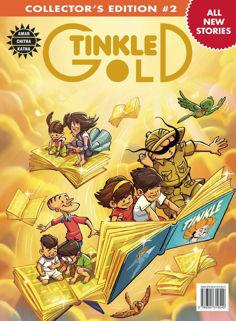 The second edition of the super bumper Tinkle Gold is here! Say goodbye to boring days and get ready for a fun ride with your favourite Tinkle Toons! Follow Shambu as he travels the world and meets amazing animals and bravely (cough cough) fights off poachers. Feel your jaw drop as the infamous Defective Detectives take on new villains and solve unimaginable mysteries. Read with bated breath as the Starlition tackle sinister threats and find themselves in grave danger. Gasp in shock at a new, different, and unimaginable Tantri! Laugh out loud at Suppandi's evergreen logical powers. Joining this ride are Ina Mina Mynah Mo, the students from NOIS, the super SuperWeirdos and the YogYodhas. All this and more waiting for you inside!