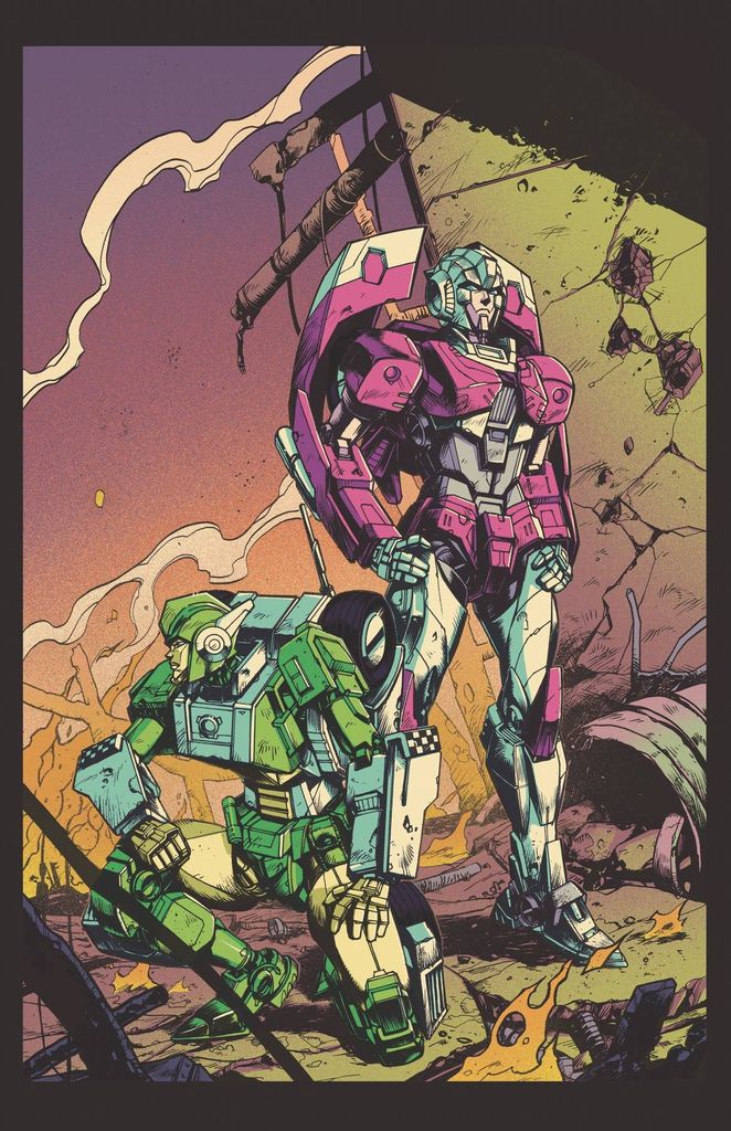 'Run.' Calamity has befallen Cybertron. The only reasonable option for many bots is escape-leaving the planet in hopes of safety. Arcee and Greenlight need to get their mentee, Gauge, off-world to protect her, but first they'll have to find a shuttle! A spotlight issue on Arcee, Greenlight, and their mentee, Gauge! Leads into next month's Transformers Galaxies #7!