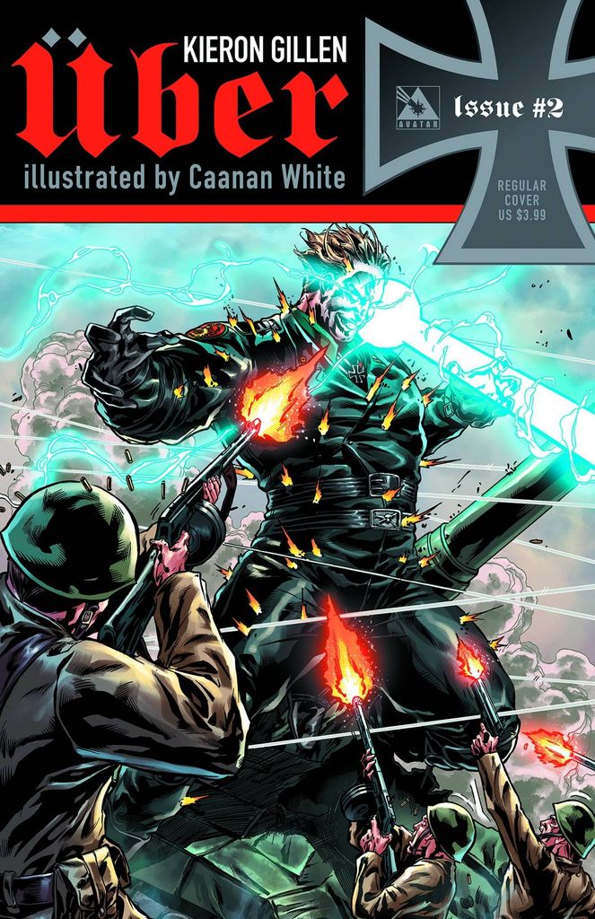 KIERON GILLEN has created a frightening alternate timeline where the Nazi war machine introduced super powered soldiers into the dying days of World War II. As one spy flees Germany with the secrets of the Ubers, the world around her falls to pieces under the onslaught of these living weapons and the Allies struggle to contend with the destruction left in their wake. The last days of Hitler's reign of terror are coming but the monsters of the master race are determined to make their enemies pay to the last. Available with Regular or Wraparound cover by Caanan White , Propaganda Poster cover by Michael Dipascale, and a special Blitzkrieg Incentive cover by Caanan White