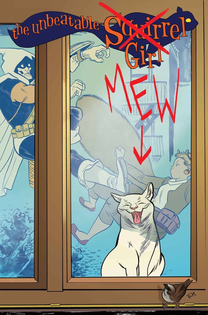 • When the TASKMASTER comes to town - and brings with him his ability to DUPLICATE ANYONE'S SWEET MOVES - who stands between him and total domination? • See, I can tell you're glancing at the title of this comic and whispering 'Well, it's PROBABLY Squirrel Girl,' but guess what? This time it's actually Nancy's cat Mew, who has NO POWERS WHATSOEVER! • THRILL as Mew loafs around the house! GASP as Mew chases a mouse and then has a nap! BOGGLE as you wonder how we possibly managed to pitch 'an issue entirely from the cat's point of view' to Marvel, a multinational corporation with a LOT invested in our comic continuing to star a squirrel and/or girl! • They knew the risks when they let Hawkeye have that Pizza Dog issue though, so this was clearly inevitable. • MEW ISSUE, BRING YOUR TISSUES! Rated T