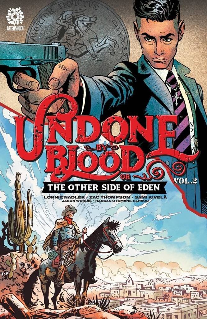 The early 1930's: The height of the Great Depression and beginning of the Dust Bowl. Silvano Luna Del Rio works as a postman in Buttar, Texas. Reeling from a tragic past, with only a gun and a Western novel to his name, Silvano sets out to take back from the country that took so much from him by robbing the first skyscraper West of the Mississippi. But acts of retribution are never as simple as they seem, as his target is home to an eccentric fraternal brotherhood hiding their own dark secrets. By Silvano's side is an old west novel featuring famed gunslinger Solomon Eaton. As both stories unfold simultaneously, in true UNDONE BY BLOOD fashion, the mythic Western informs choices in reality, for better or worse. From the minds of Lonnie Nadler and Zac Thompson (The Dregs, X-Men, HER INFERNAL DESCENT) and artist Sami Kivelä (Abbott, Machine Gun Wizards) comes the next story in the critically acclaimed neo-western series that depicts the hard truths of seeking vengeance in the real world. This 128-page collection contains the entire second volume, issues #1-4.